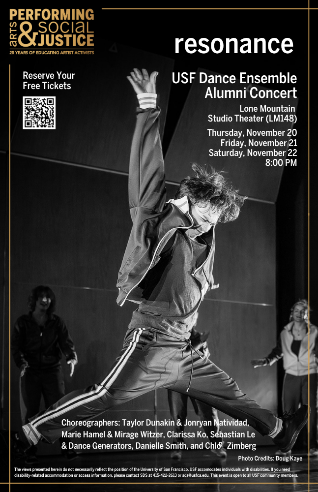 Join the USF Dance Ensemble in celebrating Performing Arts and Social Justice's 25th Anniversary. @ The USF Lone Mountain Studio Theater 2800 Turk Blvd, San Francisco, CA 94118 November 20-November 22 8 pm Original works by USF Alumni Choreographers: Marie Hamel/Mirage Witzer, Chloe Zimberg, Clarissa Ko, Danielle Smith, Sebastian Le/Dance Generators, & Taylor Dunakin/Jonryan Natividad […]